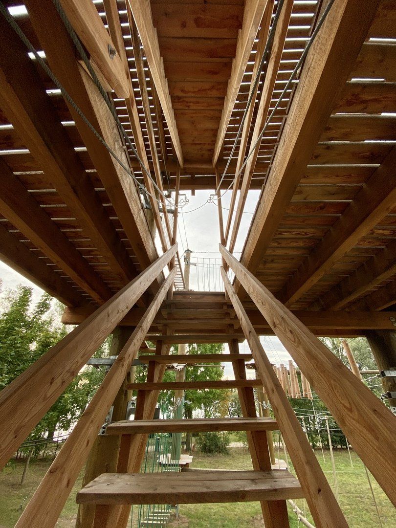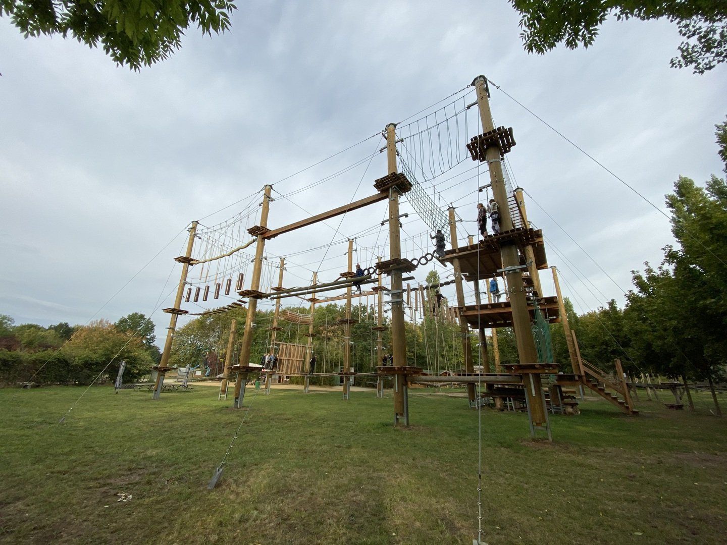 Unser Hochseilgarten erstreckt sich über drei Ebenen in Höhen von 2 Metern, 6 Metern und 10 Metern. Er bietet zwei Schwierigkeitsgrade und insgesamt 33 Kletterelemente. Unsere Anlage verfügt über ein durchgehendes Seilsicherungssystem, das es den Teilnehmern ermöglicht, den Hochseilgarten ohne Unterbrechung zu durchlaufen, ohne ihre Sicherung umhängen zu müssen.